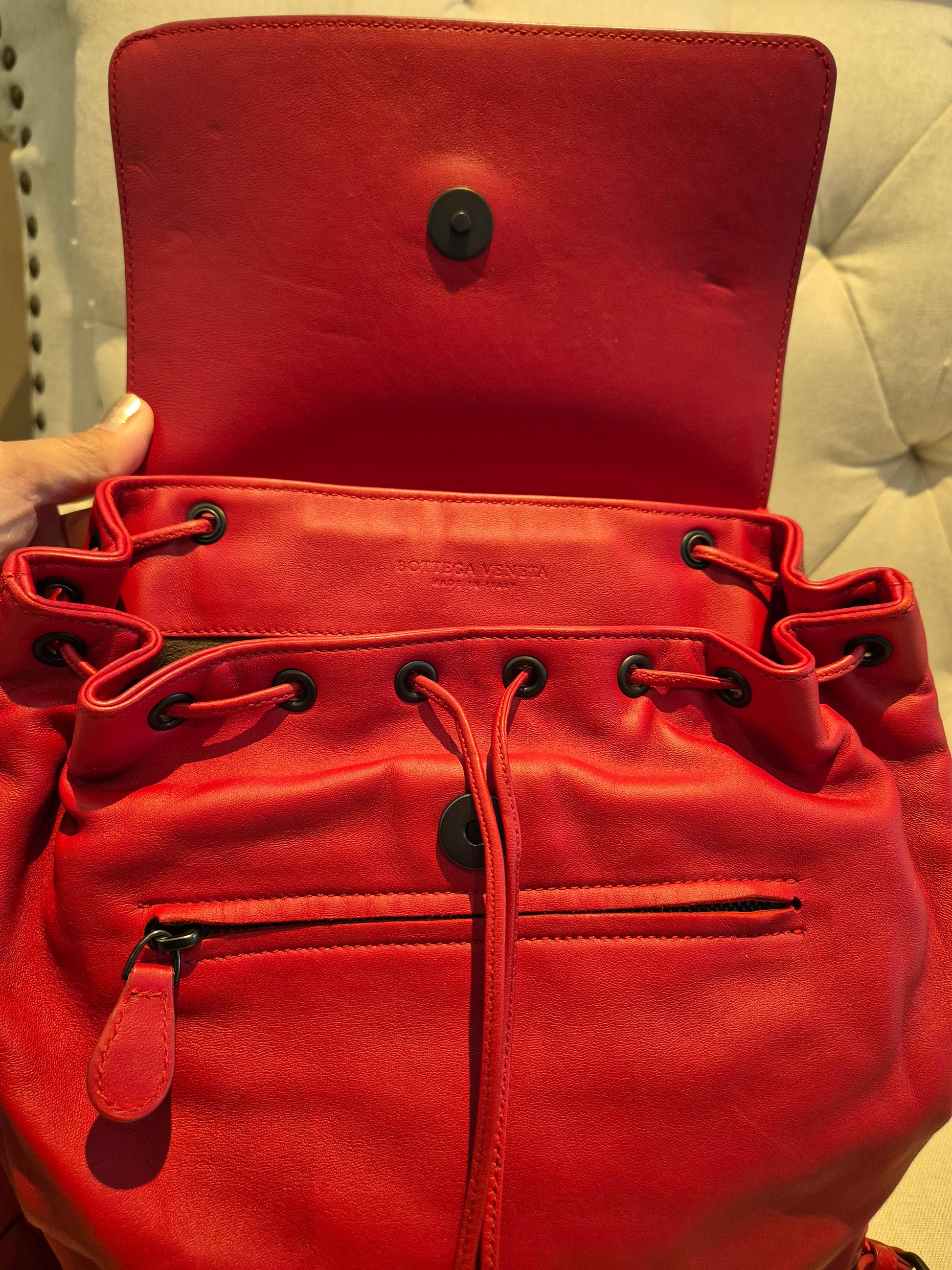 Elevate your everyday style with this stunning Bottega Veneta Drawstring Backpack in bold red Intrecciato leather—a hallmark of the brand's iconic craftsmanship. This piece combines the elegance of Bottega’s woven design with the practicality of a flap-top backpack, making it perfect for on-the-go luxury lovers.